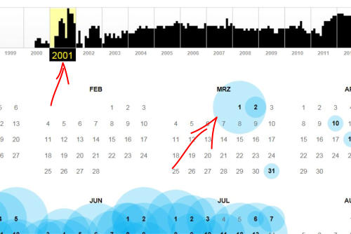 Dann wähle Jahr und Tag. Die blauen Punkte bezeichnen Tage, an denen die Seite gecrawlt wurde und die du somit ansehen kannst.