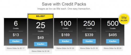 Die Bildpreise varieren, je nach Paket. Für kleine Bilder (reicht für die Homepage völlig) wird in der Regel 1 Credit berechnet. Je nach Paketgrösse wird der Preis pro Credit billiger.