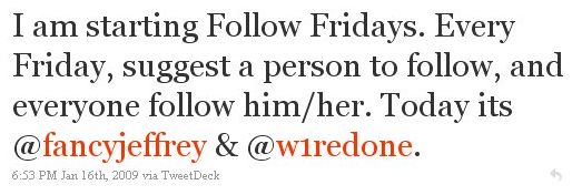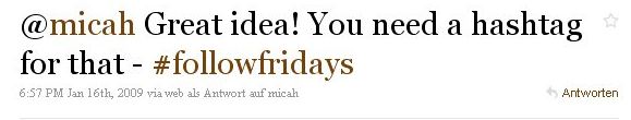 Am 16. Januar 2009 hat der Amerikaner Micah Baldwin beschlossen, den FollowFriday einzuführen. Gemacht hat er das, um einen Weg zu finden, seine bevorzugten Twitter-Profile weiterzuempfehlen.