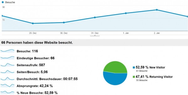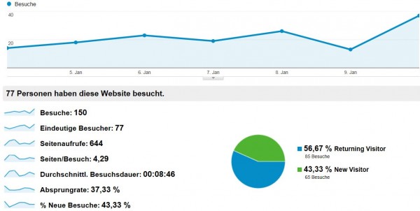 Wie man sieht, kann ich prozentual gesehen einen ordentlich Zuwachs verzeichnen. Zudem ist die durchschnittliche Besuchsdauer von 8:46, respektive 7:55 Minuten sehr erfreulich. Es scheint sich abzuzeichnen, dass es vermehrt wiederkehrenden Traffic gibt.
