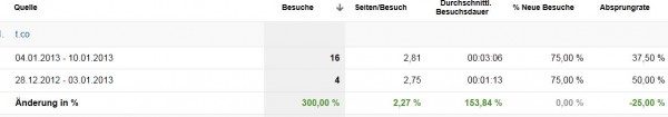 Interessant finde ich, den Zuwachs von Followern (377.8%) im Verhältnis zu der Zunahme Besuchern via Twitter (300%). Hier scheint es Parallelen zu geben.